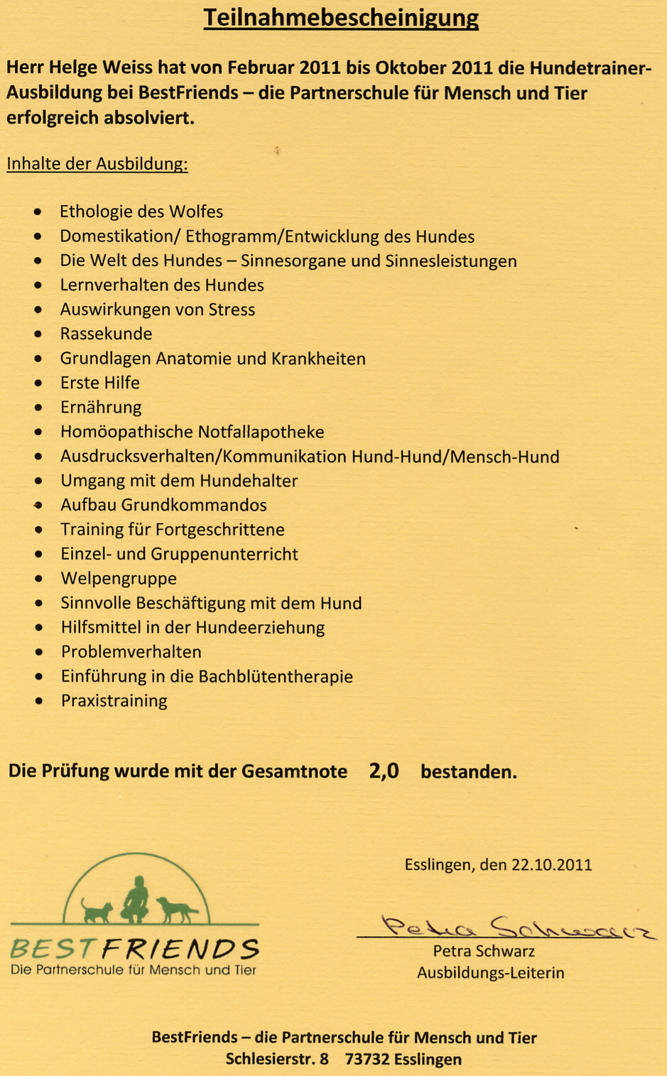Ich sah immer mehr, was bei der Erziehung meiner “Helloween” alles falsch lief und beschloss nach anderen Methoden zu suchen. Mein Wunsch selbst als Hundetrainer zu arbeiten wurde immer größer. So kam ich nach intensivem Suchen zu Petra Schwarz. Sie betreibt ihre Hundeschule best-friends in Esslingen. Bei ihr machte ich eine 10-monatige Ausbildung zum Hundetrainer. Ihre Erziehungsmethoden stehen für mich für eine artgerechte und gewaltfreie Hundeerziehung nach neuesten Erkenntnissen.